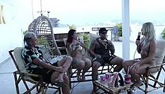 Big black cock pounds two skinny ebony sluts cowgirl style