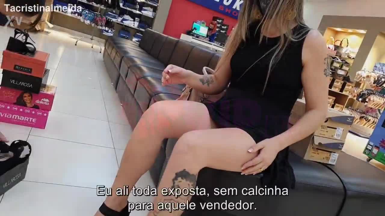 Cristina almeida flashes in a shoe store, teasing the salesman with her exhibitionist style and hairy beaver