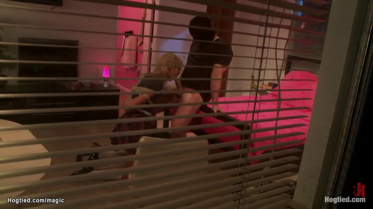 Masked men bang a bound blonde student roughly with choking and deepthroat action in group bdsm