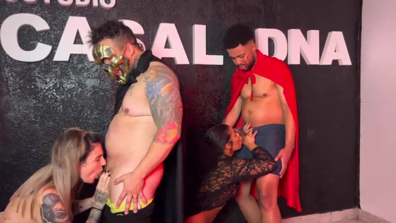 imagine four sexy babes teasing with deepthroat blowjobs and wet pussy riding behind the scenes on set